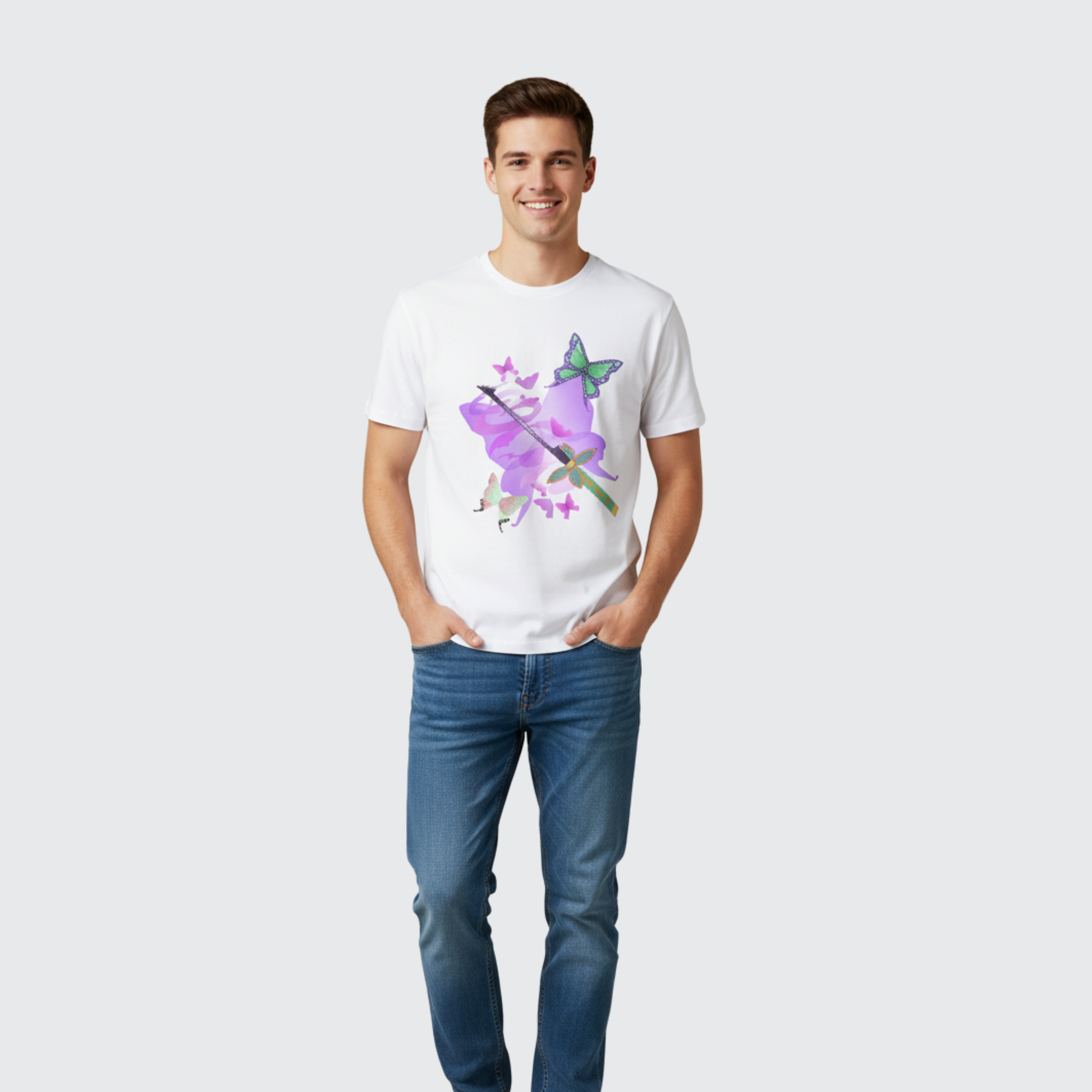 Soft voice. Lethal edge. Butterflies in motion and a stinger blade ready to strike. This design brings together Shinobu’s haori silhouette, mint and violet butterflies, and her poison-tipped Nichirin sword.